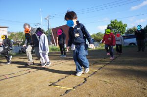初めに鬼ごっこでウォーミングアップをして、身体をほぐし