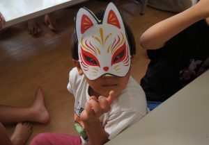 また、祭りの雰囲気をより味わうためにお面制作を行い
