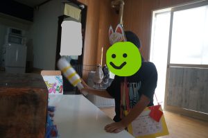 それぞれの手作りお面を頭に付けながら過ごしています!!