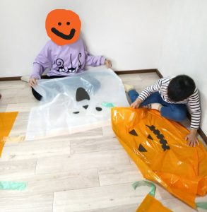 制作で作ったかぼちゃのかばんとおばけポンチョを身に付け、通りすがりのご近所さんも笑顔になっていましたよ😊✨