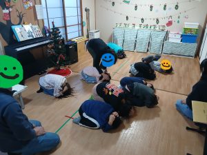 火事の時には鼻と口を布で隠すポーズ🔥 地震の時には自分の身を守るポーズをみんなで練習しています!!