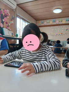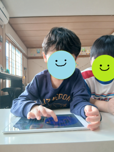 今回は、年度が替わったので「海の世界」をテーマに基本的な動き方を学んでいます。 お友達とペアになってタブレットを使い、「ここはこうするんだよ」教え合う姿もありました! 自分で描いたイラストが動くとできた!と喜ぶ子ども達です💕