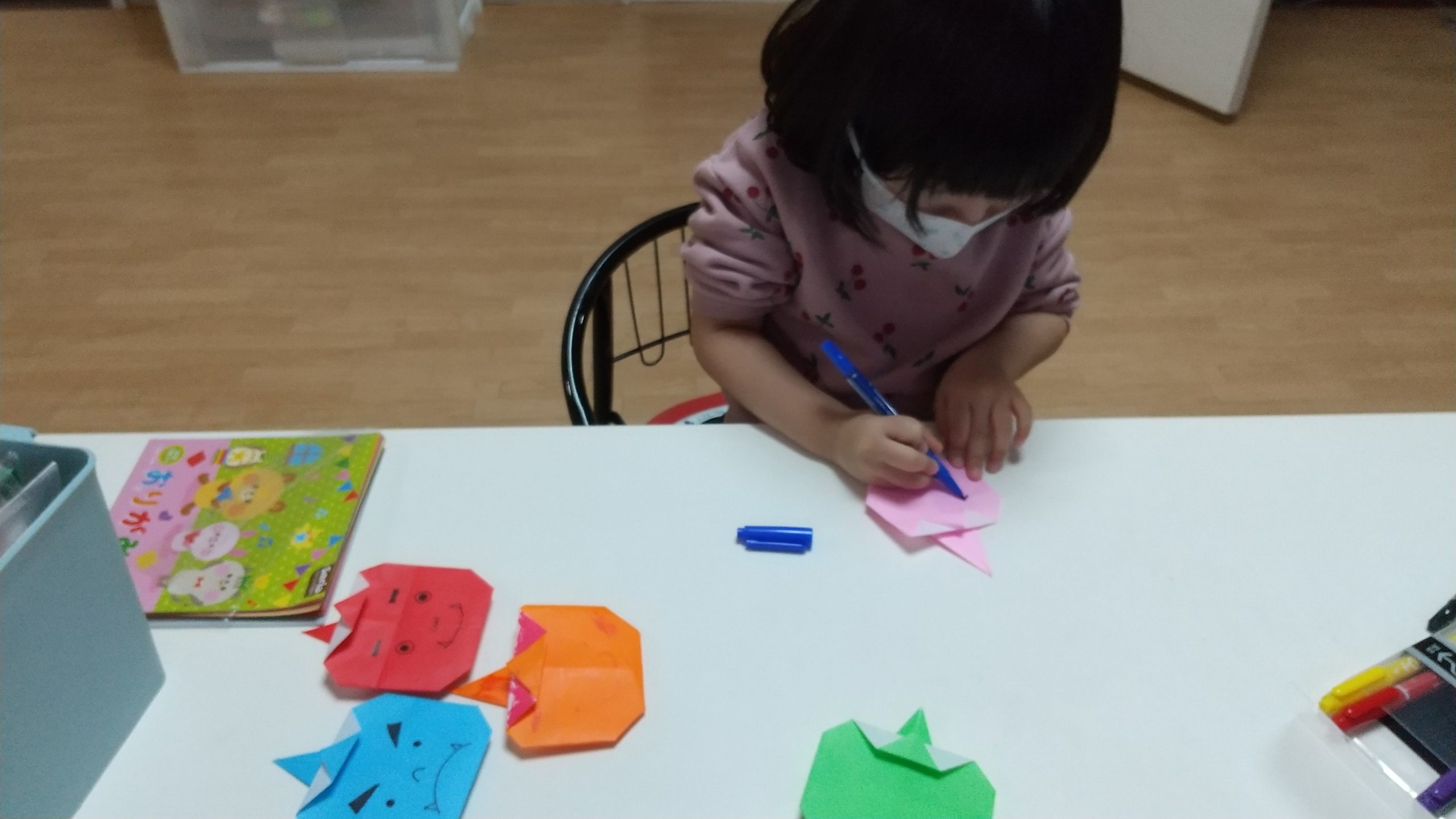 カラフルなオニの折り紙、トラ柄の豆まき用の箱とお面を作りました✂