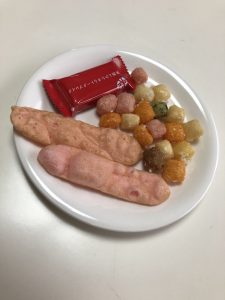 3月3日はひなまつり!ということで、おやつには「ひなあられ」とピンク色の「えびせんべい」を食べました♪