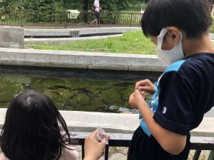中でもエサやり体験は楽しかったようで、「あのオレンジの子に食べてほしい!」と狙ってエサを投げたり