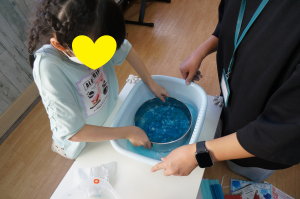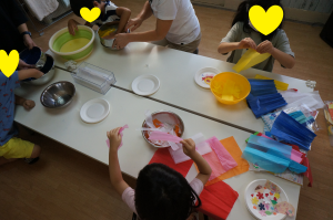 水の冷たさにみんな「気持ちいい」とご満悦の表情。水に溶けてトロトロになってきた紙に「不思議な感じ」となんとも言えない表情。様々な子どもたちの表情が垣間見える制作となりました😊