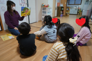 豆まきをする前に、節分の紙芝居を読むとみんな興味津々!真剣な様子で聞いていました👀