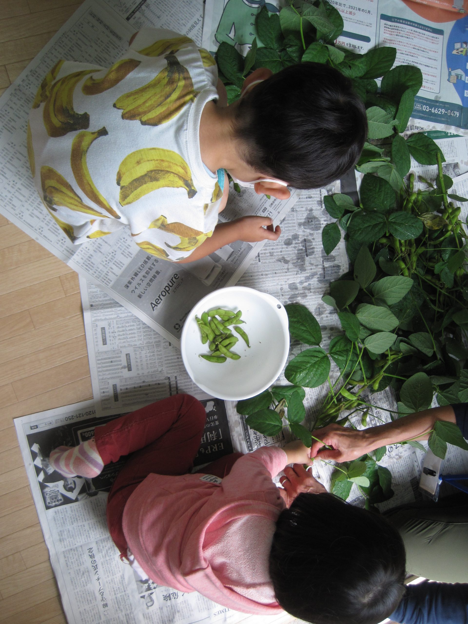 今年、一番豊作だった枝豆をいよいよ収穫! 枝から外す作業を一生懸命みんなで行いました! 豆が1つのもの、3つのもの大...