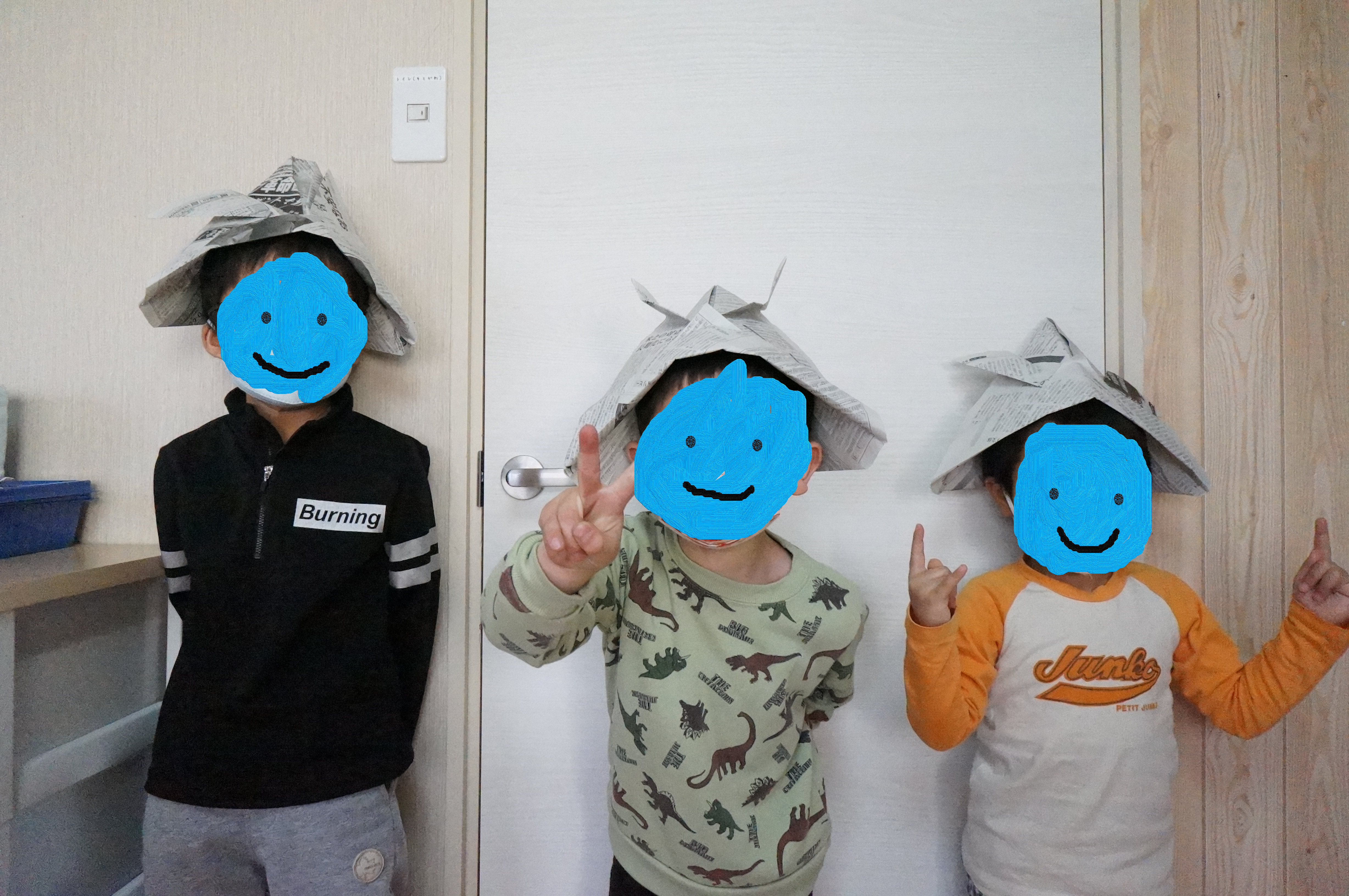 5月2日は、連休中日ということで少ない人数で男の子のみだったので 新聞紙でのんびりかぶとを作りました♪ 「むずかしそ...