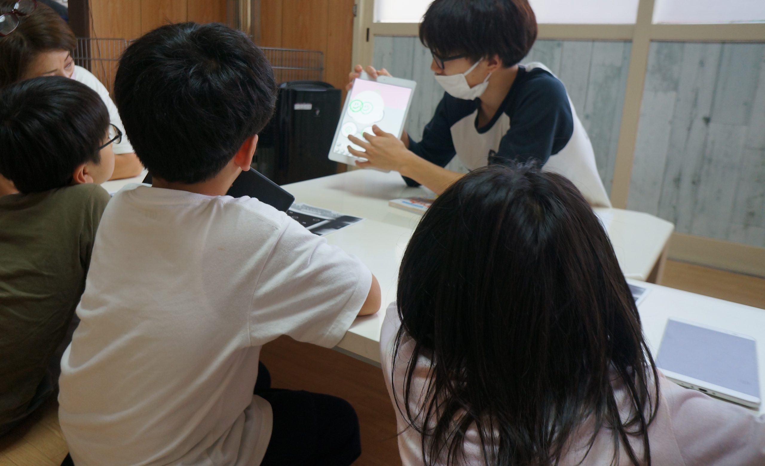 タブレットを使ってプログラミングで遊んでみました! 子ども達はスタッフの話を聞きながらも早く動かしてみたくてウズウ...