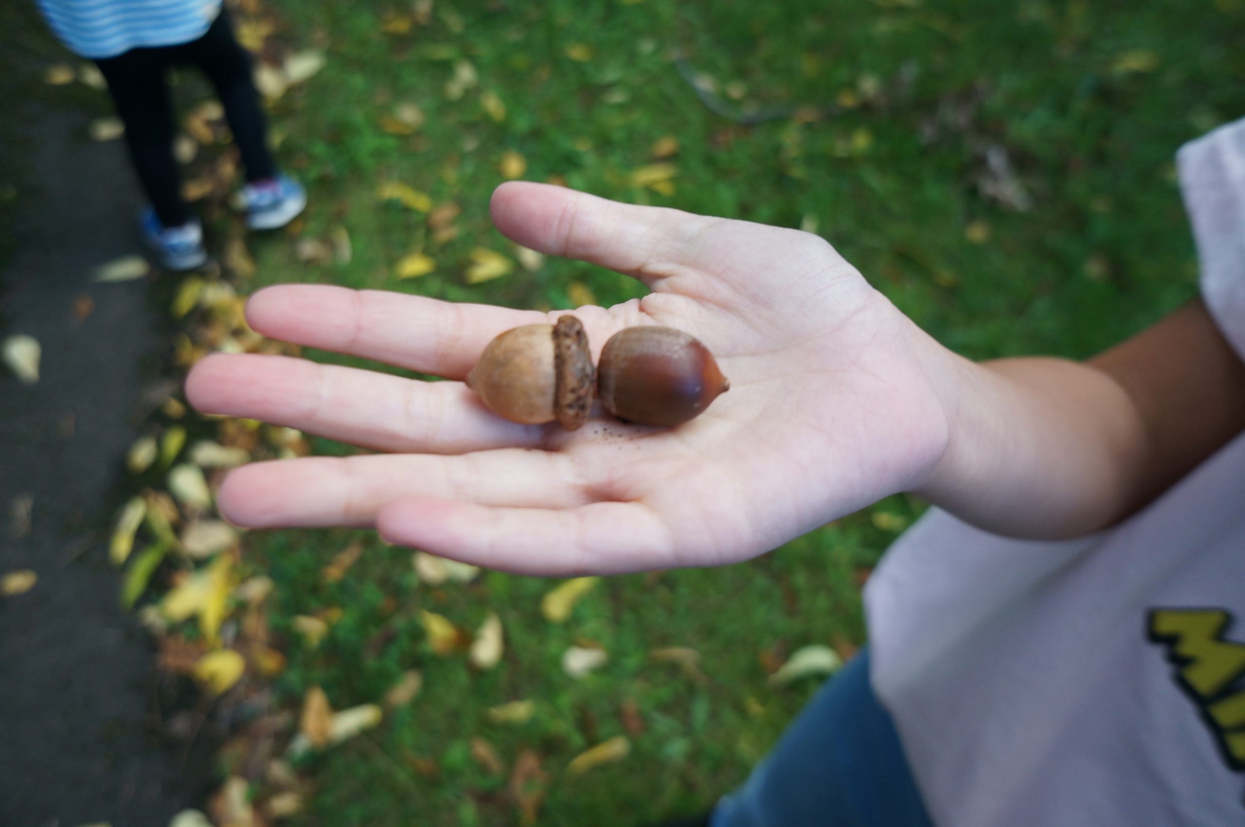 10月の製作で使う木の実や枝、葉っぱを拾いに行きました! 車で公園へ向かい、どんぐりや色付いた葉っぱを見つけると...