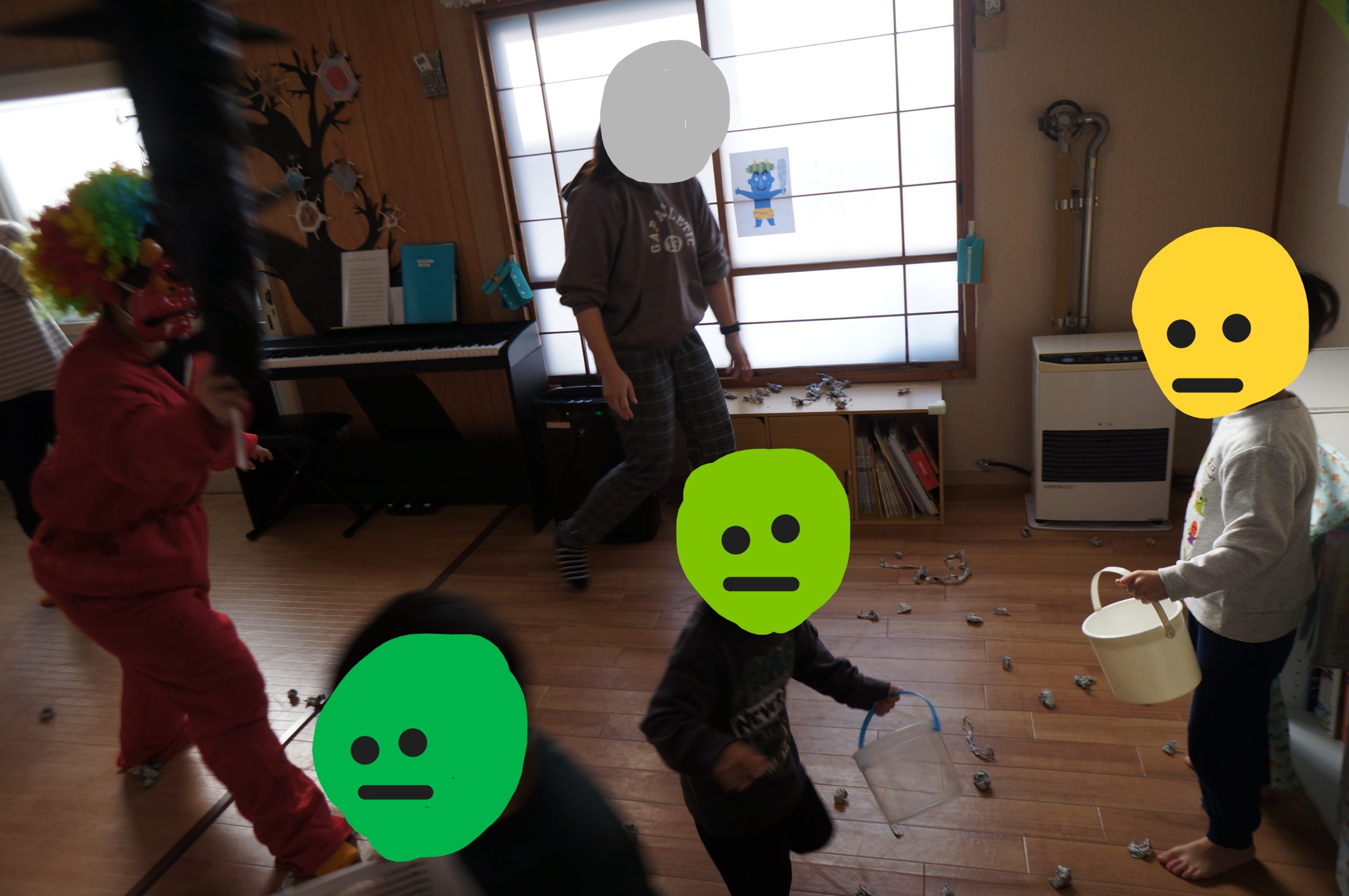 2月3日は節分行事を行いました! 部屋の中に貼ってある鬼のイラスト向かって元気いっぱい 「鬼は~そと~!福は~うち...