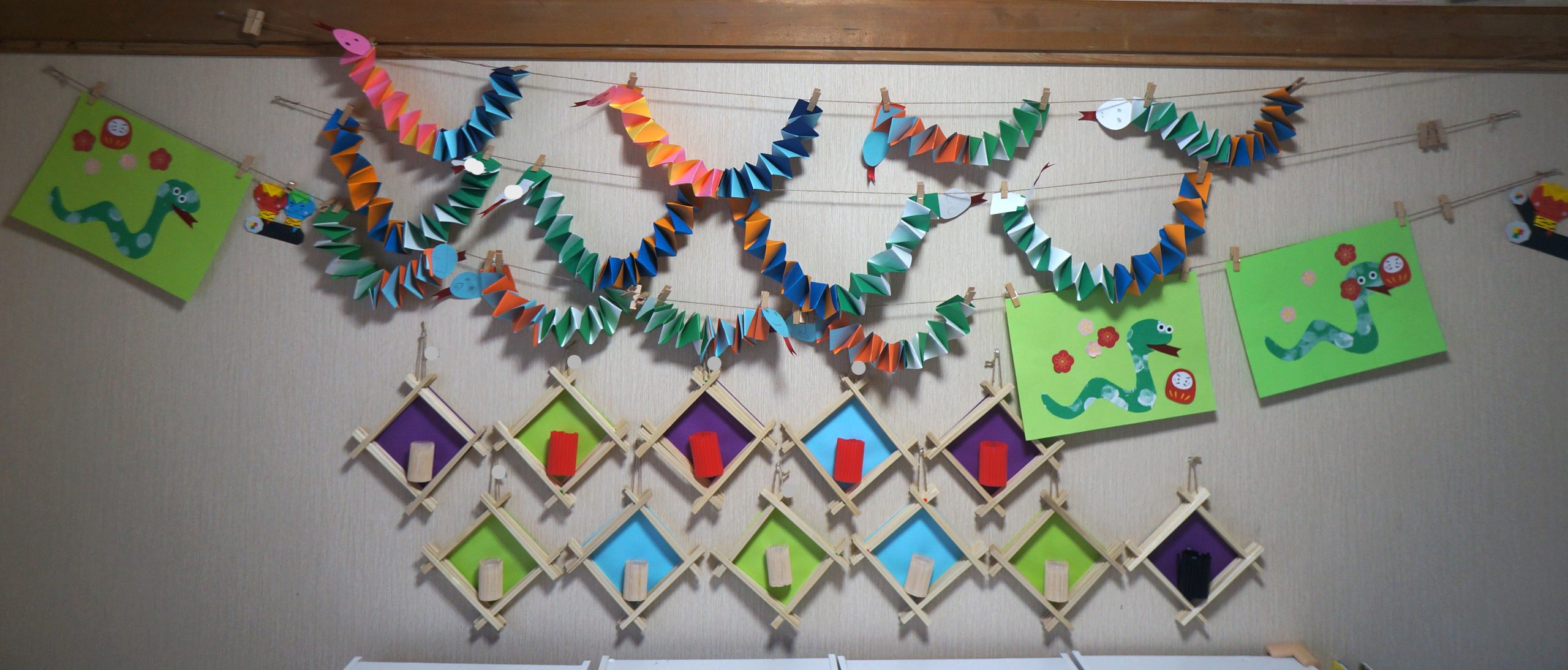1月の制作は新年をイメージしたものを作りました! 小学生は『壁掛け飾り』 割り箸とつまようじ、ストローを使用し...