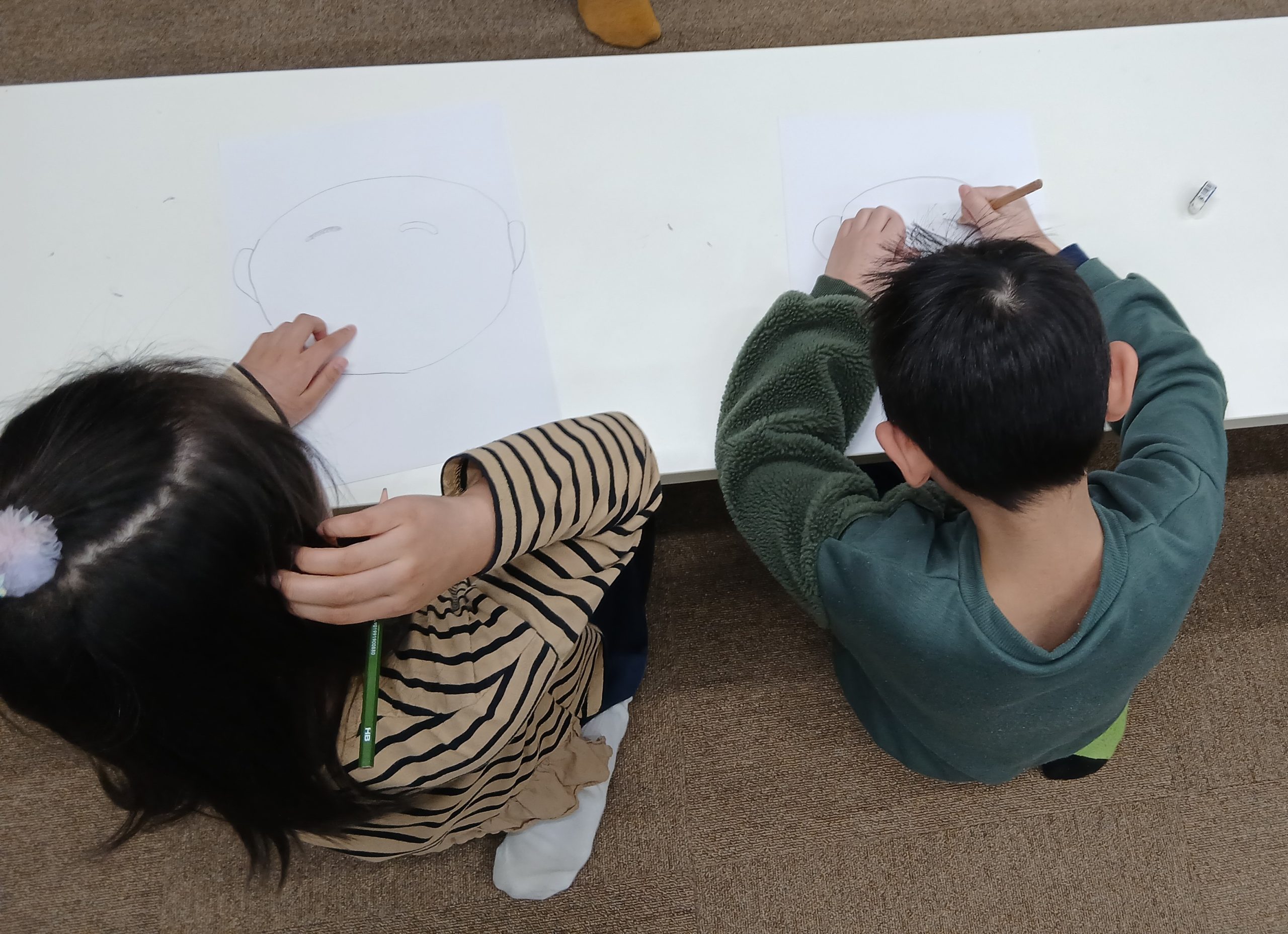 似顔絵制作を行いました! 鏡をお友達と見せ合い、自分のお顔を描いています😊 普段、自分のお顔をじ...